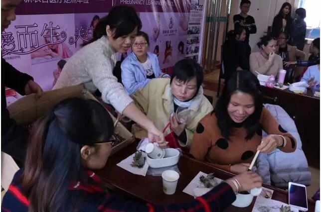 (工作人员正在为孕妈妈们手中的花盆“添料”,这些肥沃的泥土,将会让多肉肉植物长得更肥更美)