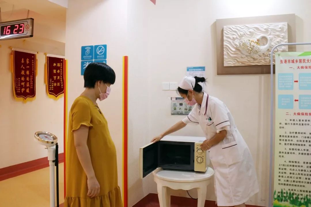 ▷ 住院部护士正在为即将入住的孕妈妈详细介绍如何使用微波炉。