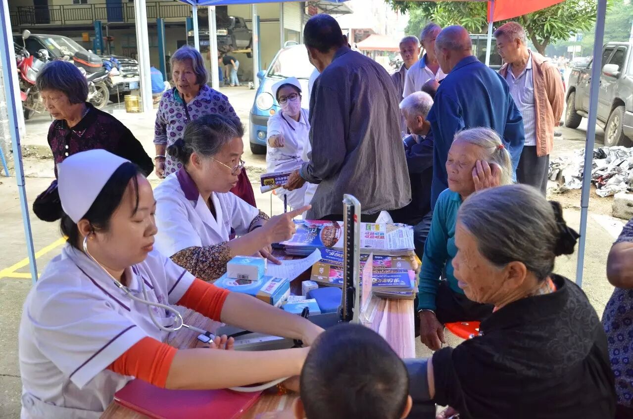 11月7日,贵港牡丹妇产医院医务人员在木松岭市场旁(小棉袄老年人活动中心门口)为市民免费问诊,迎来不少市民的围观。(下图为医务人员为有需要的人量血压、测血糖现场实拍图)